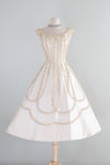 Stunning 1950s ivory satin party dress by legendary designer Ceil Chapman. Featuring a classic 50s fit and flare silhouette with a nipped waist and full skirt. The satin fabric is decorated with cotton lace embroidered with glass beads, pronged rhinestones and tear shaped pearls. The interior of the skirt is lined in pellon giving it structure and shape. Zips up the back with original metal zipper. In overall excellent condition, freshly cleaned and ready to wear.