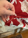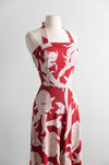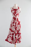 This exceptional 1940s Kamehameha halter dress exemplifies vintage Hawaiian fashion at its finest. The cool rayon fabric drapes beautifully in deep brick red, adorned with sophisticated grey and ivory floral motifs characteristic of the era. The halter neckline flatters the shoulders while the cotton-lined bodice ensures comfort and structure. A semi-full skirt provides elegant silhouette and movement, finished with original metal back zipper.