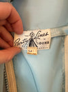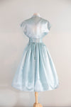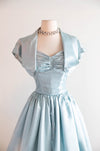 The dreamiest 1950's Alice in Wonderland crystal blue slipper satin party dress by Emma Domb with matching bolero jacket. Featuring a classic fitted bodice with ruched center and boning for structure and support. The skirt is full and gathered and falls below the knees in a classic tea length. Zips up the side with original metal zipper. In excellent condition, freshly dry cleaned and ready to wear.