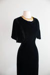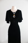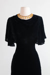This exquisite 1930s evening gown exemplifies the era's most coveted silhouette. Crafted from luxurious black silk velvet, the bias-cut construction creates an hourglass figure with sophisticated precision. Delicate flutter sleeves frame the shoulders while subtle shirring adds dimension and movement. The distinctive cowl neckline provides an elegant focal point, and the keyhole back creates an unforgettable exit. Slips on over the head and stretches generously to fit a range of small to medium sizes. A masterpiece of vintage couture engineering that captures the glamour and refinement of the Depression-era's most glamorous evenings. In overall excellent condition, freshly cleaned and ready to wear.