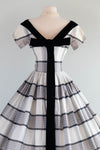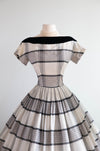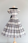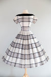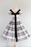 Absolutely fabulous 1950's party dress by New York based label Suzy Perette. Suzy Perette was known for producing high quality, ready to wear versions of Christian Dior designs under a special licensing agreement. This wonderful party dress is made of a crisp cotton blend in a bold black and grey plaid. Featuring a bateau neckline trimmed in lush black velvet that dips in a v in the back and falls into a dramatic bow. Zips up the back with original metal zipper. A classic party dress by one of our favorite vintage labels.