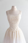An absolute dream come true! Vintage early 2000's tulle wedding gown lavishly embellished with shimmering sequins and tiny pearls. Featuring a fitted slightly dropped waist, beaded shoulder straps, and a lusciously full multiple layered skirt. The gown is fully lined and beautifully constructed. Zips up the back with original zipper. In excellent condition, freshly dry cleaned and ready to wear.