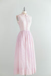 The dreamiest early 1950's misty lavender cotton organdy eyelet midi length formal gown. This sheer eyelet gown features a fitted bodice with tiny covered buttons down the front. The skirt is full and gathered. Original metal zipper up the side. Beautifully handmade. In overall excellent condition, freshly cleaned and ready to wear.