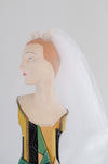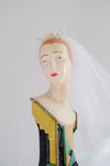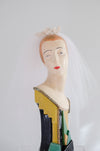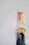 A beautiful 1950s wedding veil featuring an elegant wax flower crown adorned with delicate pearls and secured wire detailing. The shoulder-length design pairs seamlessly with classic updos or worn at the crown, while the integrated blusher gracefully frames the face. Complete with a secure comb attachment for reliable positioning throughout your celebration. An authentic vintage piece that captures the romance and sophistication of mid-century bridal elegance.