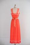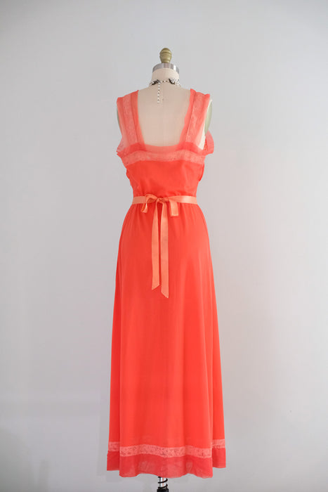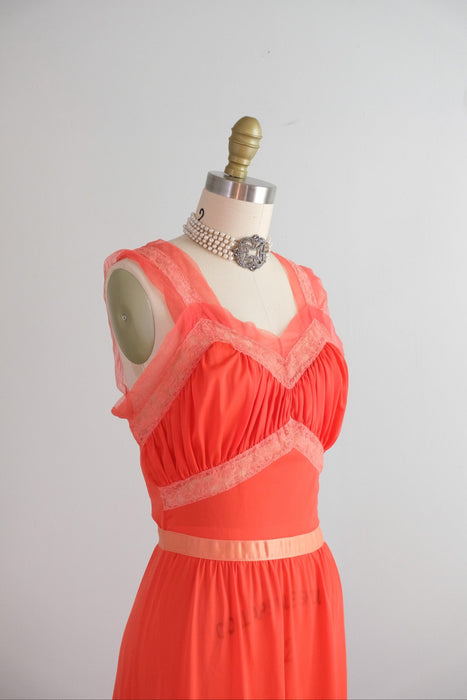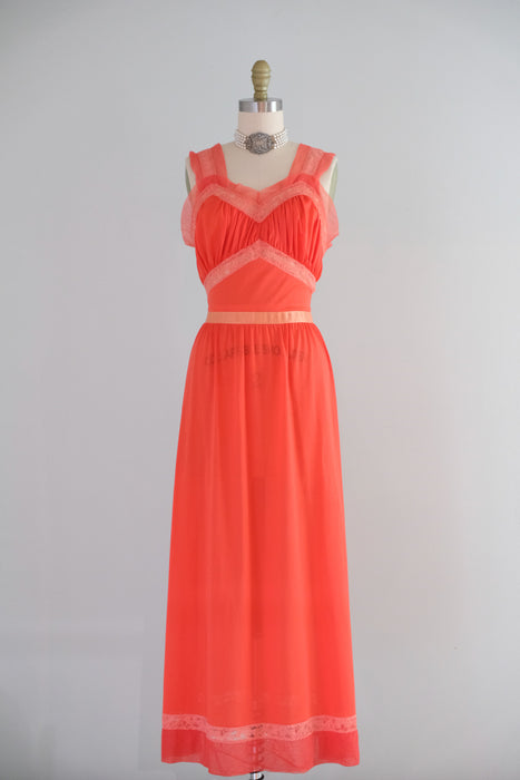 Vibrant 1950's nylon & lace nightgown in poppy red. Super romantic sleeveless gown with a sweetheart bust and ribbon tie around the waist. Full length semi-sheer nylon gown with sheer lace details throughout. No zips of closures, put on overhead to wear. Freshly cleaned and ready to wear!