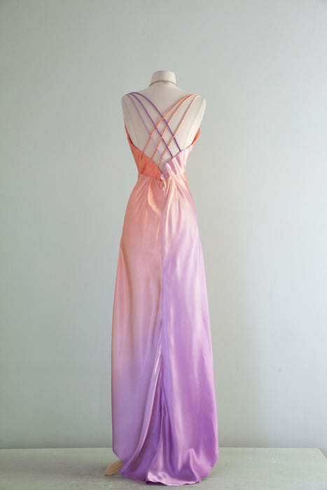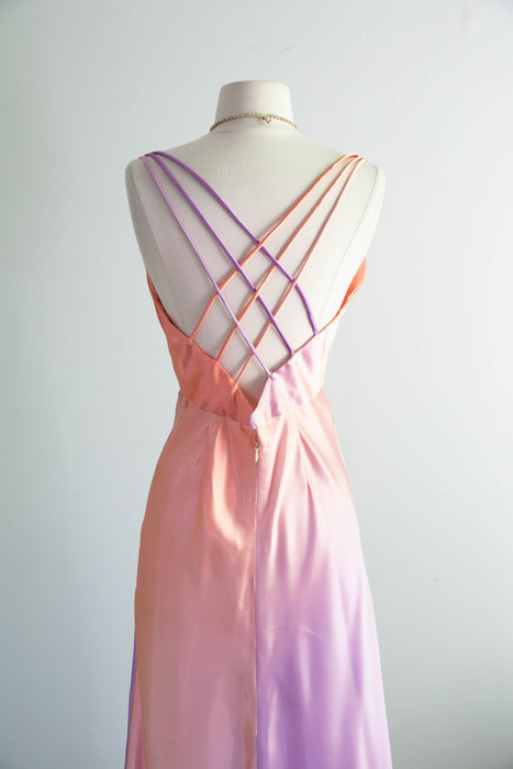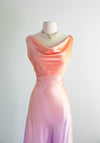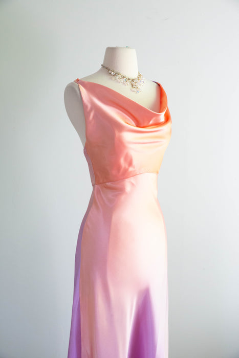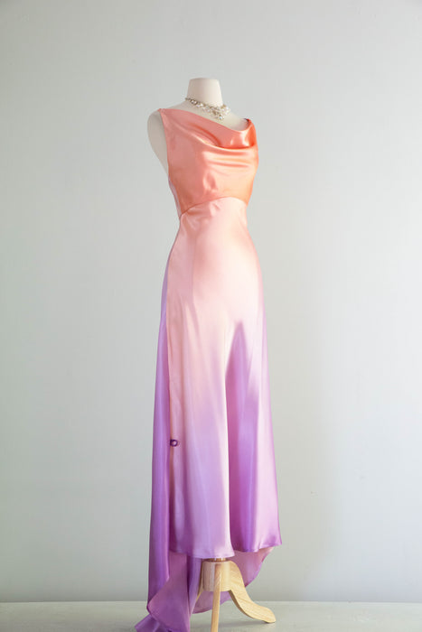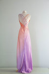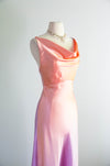 From your wildest dreams comes this stunning liquid satin bias cut evening gown in ombre shades of wild orchid and sensual peach. Custom made I think in the 70's this gown harkens back to 1930's glamour and features a cowl neckline, hourglass silhouette and short train with finger loop. The most dramatic feature is the back with contrasting straps. Zips up the back. In excellent condition, freshly dry cleaned and ready to wear.