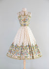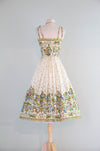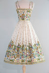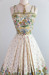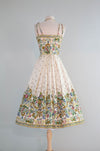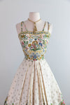 One of the prettiest 1950’s dresses I have ever seen! Breathtaking baroque influenced barkcloth cotton border print dress couture made in the early 50’s. Feminine fitted waist and bust with full pleated skirt. Pronged rhinestones decorate the bust. Zips up back with original metal zipper. In excellent condition, freshly dry cleaned and ready to wear.