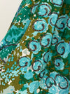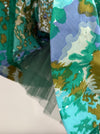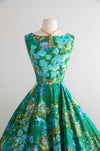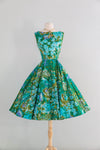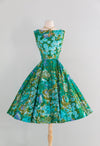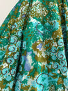 This captivating 1950's dress evokes Monet's impressionist gardens through its sophisticated palette of aquamarine, teal, French blue, and olive green. The abstract floral pattern, enhanced with glittering swirls, creates a mesmerizing visual effect across the premium cotton fabric. Architectural perfection defines the silhouette—a fitted bodice transitions gracefully into a voluminous skirt dramatically lined with green tulle. Featuring a discreet side zipper closure and preserved in excellent condition, freshly dry cleaned and ready to wear.