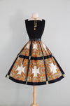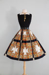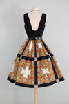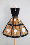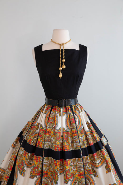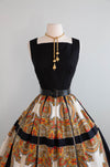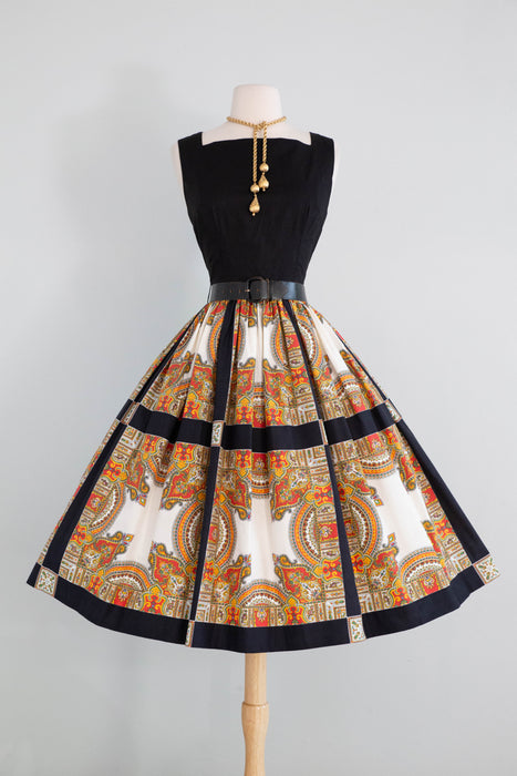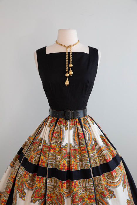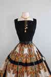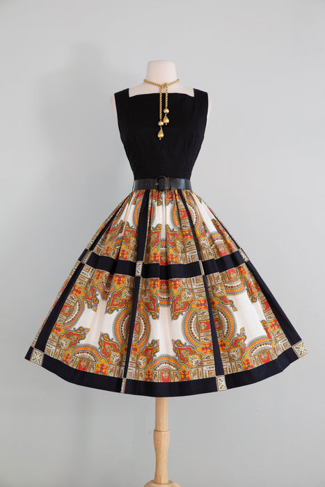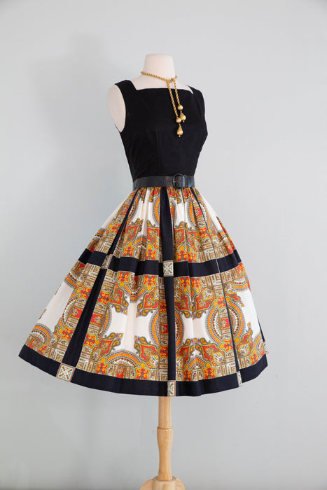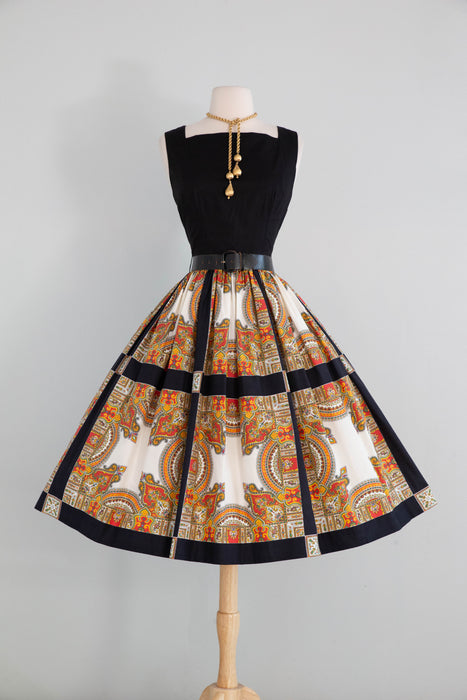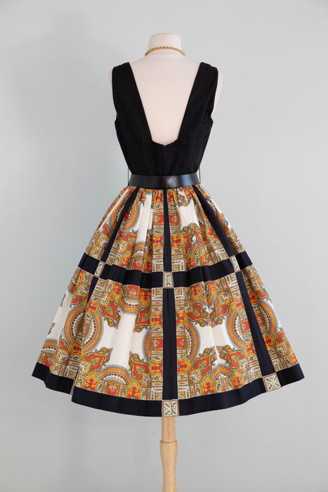 One of my all time favorite 50's summer dresses! This 1950's classic is made of 100 % cotton and features an incredible full skirt in a dramatic baroque border print and fitted black sleeveless top with low back. Such an incredible print. Zips up the back with original metal zipper. In excellent condition, freshly dry cleaned and ready to wear.