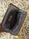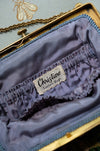 This exquisite 1950’s small needlepoint evening bag by Christine Custom Bags from Detroit, Michigan exemplifies expert craftsmanship. Renowned for transforming needlepoint into custom handbags, Christine Custom Bags features linings in coordinating colors with finely pleated pockets. Typically adorned with gold metal hardware and a chain handle, this piece showcases a romantic floral motif, intricate floral engravings on the frame, a secure push clasp, and a blue-lined interior equipped with two functional pockets.