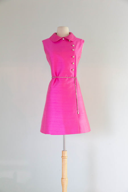 Sold Out Absolutely Fabulous 1960's HOT PINK Silk Cocktail Dress With Rhinestone Belt By Jerry Silverman / M $298.00