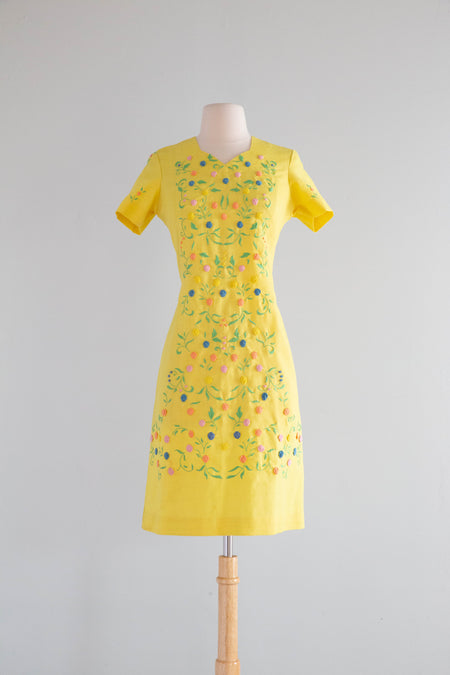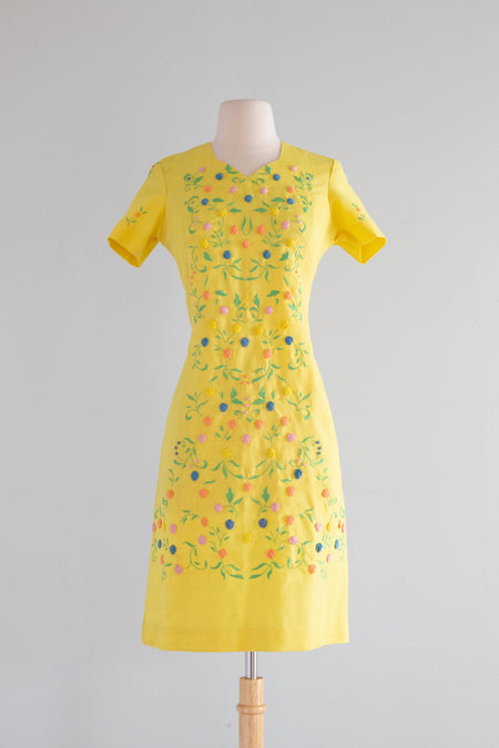Adorable 1960's Daffodil Yellow Shift With Embroidered Flowers / SM