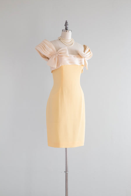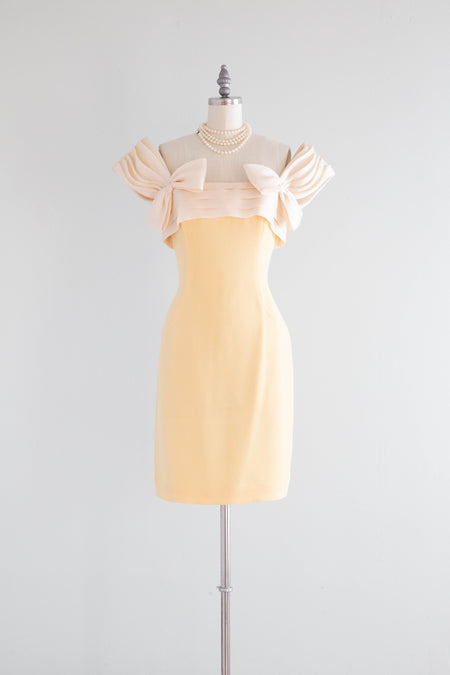 Beautiful 1980's Butter Yellow Silk Dress With Ivory Bows and Shoulders / SM