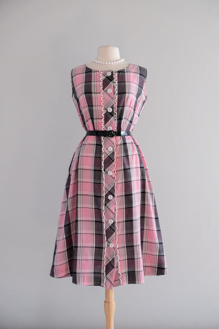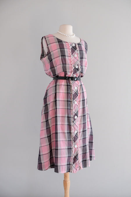 Classic Vintage 1950's Pink Plaid Cotton Dress by Brentwood / XL