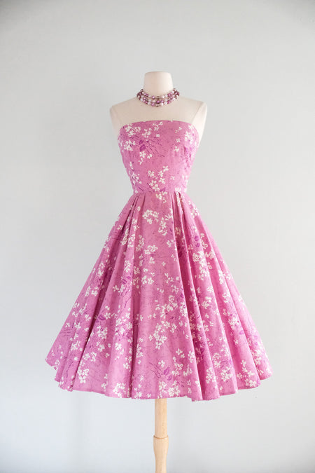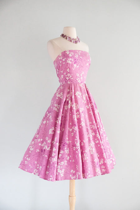 Vintage 1950's Orchid Pink Strapless Floral Cotton Dress / XS