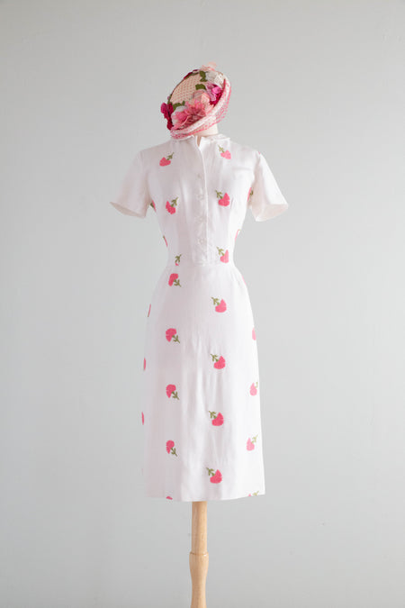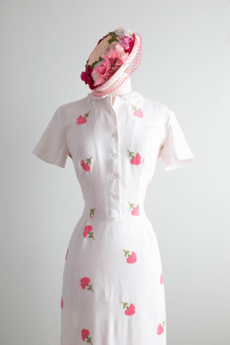 Darling Late 1950's Embroidered White Linen Dress With Pink Carnations / M