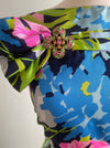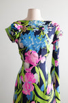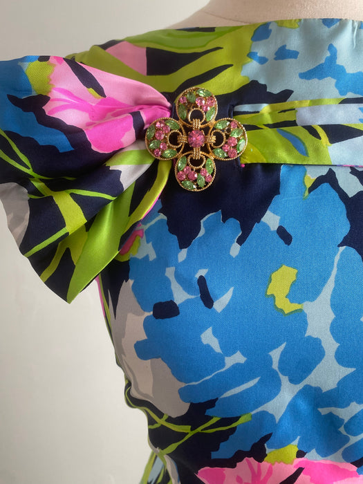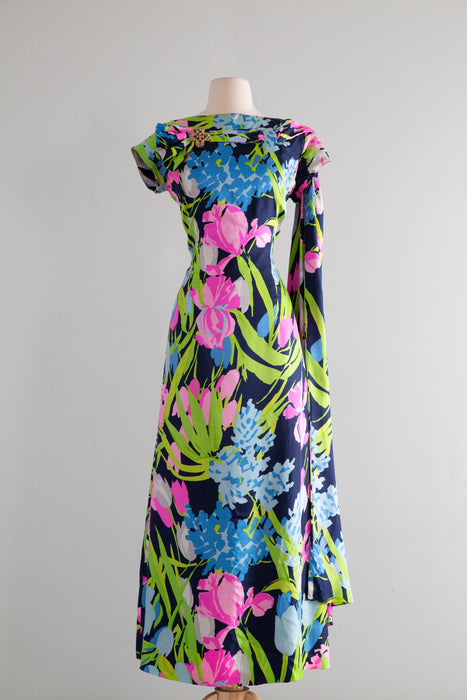 Spectacular late 1960's silk garden print maxi dress with a dramatic shoulder swag! Perfect for a spring or summer gala! This gorgeous piece features a striking boat neckline with woven sash that transitions into a dramatic shoulder swag. Princess seams up the front for a flattering fit. Fully lined interior. In excellent condition, freshly dry cleaned and ready to wear.