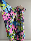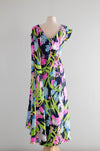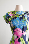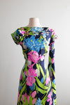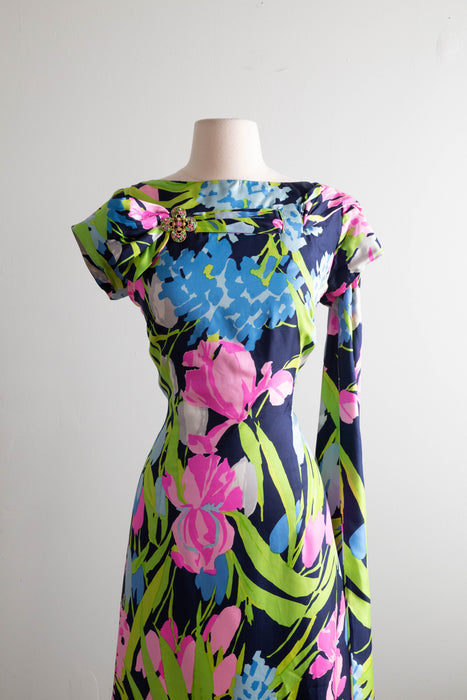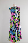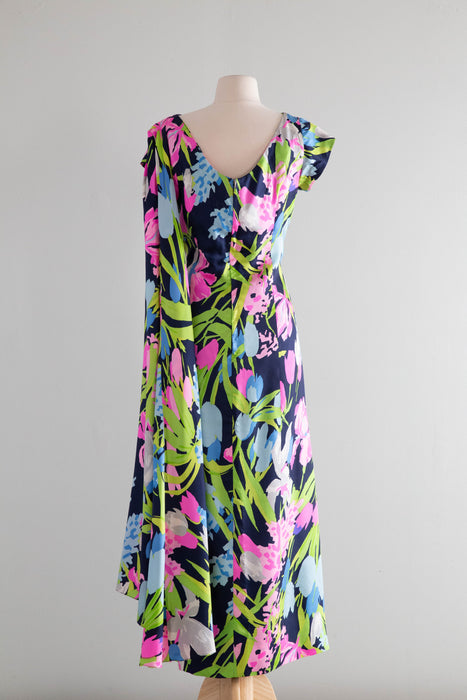 Spectacular 1960's Silk Garden Print Maxi Dress With Shoulder Swag / ML