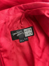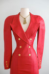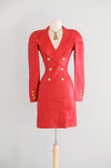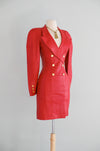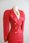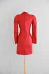 Turn heads with this striking red leather mini dress from Michael Hoban North Beach. Featuring a sleek silhouette, long sleeves, and bold double-breasted gold buttons paired with a tailored suit jacket lapel, this piece epitomizes vintage 1980s style. It conveniently zips up in the back and has been professionally cleaned for immediate wear.