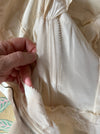 An exquisite example of mid-century bridal elegance, this 1950s ballet-length wedding dress by Cahill of Beverly Hills captures the era’s signature blend of romance and refinement. The sculpted bodice is fashioned from ivory lace over satin, shaped with precise seaming and overlaid at the neckline with finely pleated illusion tulle that sweeps into a softly off-the-shoulder portrait line. A delicate lace appliqué panel traces the décolletage, adding depth and dimension while maintaining the gown’s airy lightness.