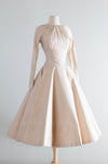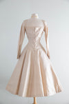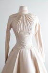Stunning 1955 peau de soie cocktail dress by Luis Estevez in a pale shade of what I would describe as almond bisque. Featuring long fitted sleeves, a dropped waist, a gorgeous gathered neckline and square back. The skirt is cut in a full circle and is backed in stiff pellon to maintain the shape. Zips up the back with original metal zipper. Being offered at a discount due to faint water marks throughout. Still close up pictures. Wears and presents beautifully. Freshly dry cleaned and ready to wear.
