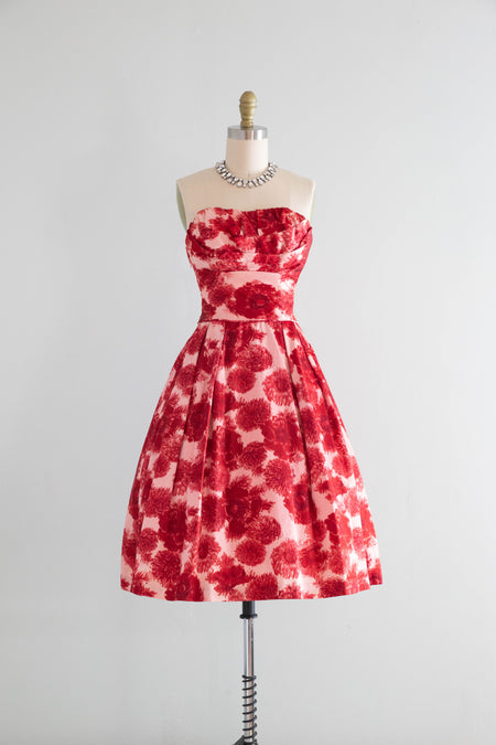 Elegant 1950's Poppy & Dahlia Print Silk Faille Cocktail Party Dress / XXS