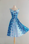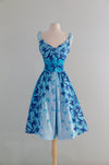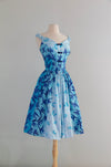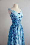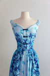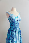 This rare 1950's Kamehameha romper showcases iconic Hawaiian style with its brilliant ocean blue fabric adorned with birds of paradise and butterflies. Crafted from soft cotton, it features a fitted waist, elastic cap sleeves, and delicate cotton frog closures. The design cleverly disguises wide culotte pant legs as a full skirt, complemented by a front zipper and a lined bodice for comfort. With practical pockets and authentic craftsmanship made in Hawaii, this piece embodies mid century summer glamour. In overall excellent condition, freshly washed and ready to wear.