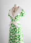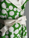 A fabulous example of mid-century American fashion, this 1960s Malcolm Starr by Rizkallah gown is a showstopper in vibrant Kelly green with oversized white polka dots. Cut in a sleek, floor-skimming A-line silhouette, the gown features a dramatic oversized white silk shantung lapel collar, short sleeves, and a matching bow belt that cinches the waist to perfection. Did I mention it has pockets?! The lively textured cotton polka-dot fabric adds dimension and playful movement, while the impeccable tailoring speaks to the craftsmanship of the era. Closed up the front with hook and eyes and snaps. In excellent condition, freshly dry cleaned and ready to wear!