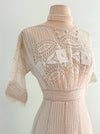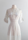 Truly a wonder to behold, this extraordinary 1900's era ivory cotton Edwardian lawn dress is the perfect thing for your special day- or any day for that matter! Featuring some of the finest attention to details and embroidery I have seen. Adorned with embroidered roses and rows and rows of pin tuck pleats on a semi sheer cotton background. Inset lace and sheer panels add interest. Original covered buttons up the back. In overall excellent condition for its age. Freshly hand laundered by me and ready to wear.