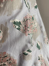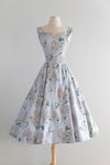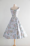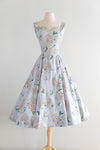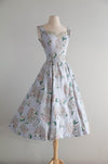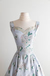 The dreamiest 1950's dress in town! Gorgeous mirror blue polished cotton party dress with a delicate pink and green hydrangea print. Featuring a sweetheart neckline trimmed in sequins, a fitted waist, a full pleated skirt and gather back. Zips up the side with original metal zipper. In overall excellent condition, freshly cleaned and ready to wear.