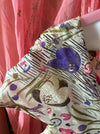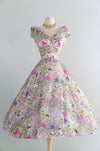 Float through summer soirées in this ethereal 1950's paper silk party dress. The semi-sheer abstract floral garden print creates a dreamy aesthetic, while the full circle skirt and defined waist offer timeless feminine silhouette. Featuring an elegant shawl collar and meticulous construction, this fully lined vintage treasure secures with a side metal zipper—perfect for special occasions, weddings, or bridal celebrations. In overall excellent condition, freshly dry cleaned and ready to wear.