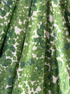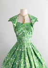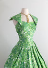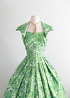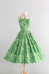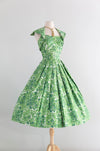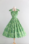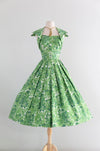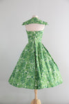 This glorious 1950's Carolyn Schnurer summer dress exemplifies the designer's celebrated contribution to mid-century American fashion. Schnurer, recognized for her innovative approach to feminine sportswear, created this stunning two-piece ensemble featuring a structured halter bodice with an unusual detachable wrap-around collar detail that buttons to the back. The garment showcases period-specific construction techniques including a full pleated skirt, hidden side pockets, metal zipper up the back, and quality interior lining and boning. Fabricated in "everglaze" polished cotton—a premium textile of the era—in a distinctive green clover print. The dress can be worn strapless as well, the shoulder straps can be taken off. In excellent condition, freshly dry cleaned and ready to wear.