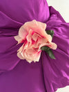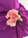 Outrageously glamorous late 1950's violet silk cocktail dress by the maestro of glamour Mr. Blackwell. Featuring an iconic wiggle silhouette enhanced by a dramatic asymmetric hip swag that drapes across the skirt and comes together with a pink silk rose. The shape combined with the color make this dress a true show-stopper! Fully lined interior. Zips up the back with a replaced zipper. In excellent condition, freshly dry cleaned and ready to wear.