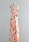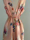 Embrace timeless elegance with this dreamy 1940's bias-cut slip dress by Corticelli. Crafted from peach rayon satin adorned with a delicate floral print, it flatters your figure with an hourglass silhouette and adjustable waist ties. Effortlessly slip it on for a graceful look that captures classic femininity and charm. Perfect for special occasions, the fabric is sturdy enough to wear out as a dress.