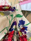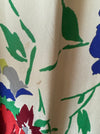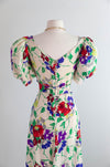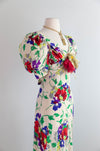 Utterly breathtaking and rare 1930's floral print silk gown. The bias cut creates a flattering hourglass silhouette, while the ivory silk background showcases a bold, joyful floral pattern. Features include a gathered bust, sweetheart neckline, dramatic puffy sleeves, and elegant covered buttons down the back. The fish tail hem adds drama, making this stunning piece perfect for garden parties or as a unique wedding gown. In overall excellent condition, freshly dry cleaned and ready to wear. Truly a rare and heirloom worthy treasure.