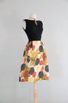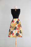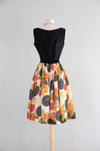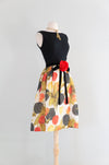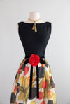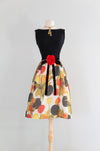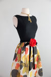 Absolutely fabulous early 1960's cocktail dress. The refined black sleeveless silk bodice transitions beautifully into a semi full pleated silk organza skirt, showcasing an artistic arrangement of bold red, yellow, and green roses with big black polka dots. Accentuated by an accompanying velvet sash with red rose detail, this meticulously lined garment exemplifies mid-century craftsmanship. Can be worn with or without the sash. Zips up the back with original metal zipper. In overall excellent condition, freshly dry cleaned and ready to wear.