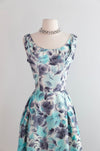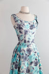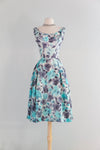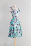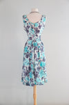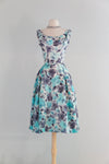 This sophisticated 1950's cocktail dress features a delicate aquamarine and charcoal silk rose print, expertly crafted with a fitted waist and semi-full pleated skirt to enhance your silhouette. The scoop neckline adds timeless elegance, while the fully lined interior ensures comfort and structure. A discreet metal zipper at the back provides a seamless finish. Ideal for weddings and special occasions. In very good condition, freshly cleaned and ready to wear.