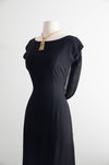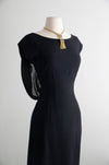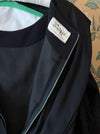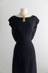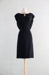 This elegant early 1960's little black cocktail dress features a fitted wiggle silhouette enhanced by princess seams for a flattering shape. The standout silk back is adorned with a glamorous bow accent, complemented by a classic boat neckline. Fully lined and finished with a discreet metal zipper up the back, this dress combines vintage charm with refined craftsmanship. In excellent condition, it offers timeless sophistication for special occasions.