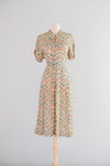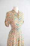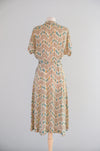 Step back in time with this charming 1940's rayon dress by Pam Paterson. Featuring a delightful beige print accented with teal and honey yellow half diamonds arranged in graceful curved rows, this dress brings vintage flair to life. Its short sleeves and fitted waist highlight a wide box-pleated skirt that moves with you. Front buttons and a side metal zipper add classic details. Freshly cleaned and ready to twirl into your wardrobe!