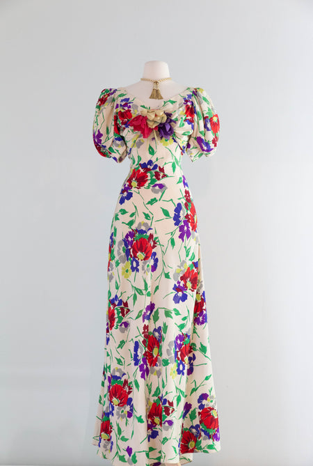 Gorgeous 1930's Floral Print Silk Bias Cut Garden Party Gown / SM