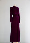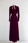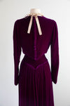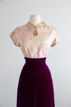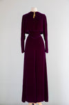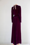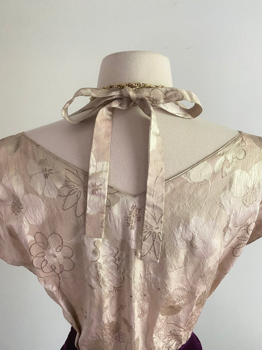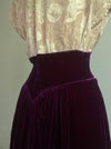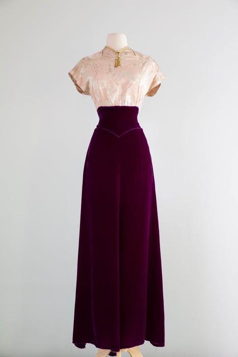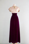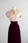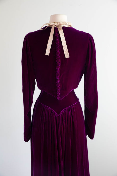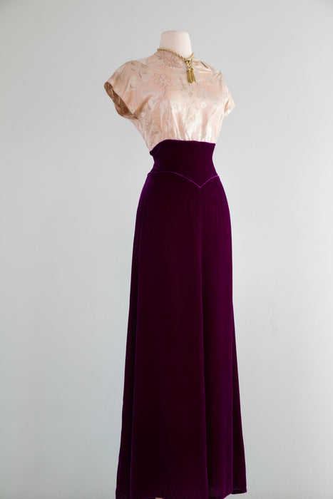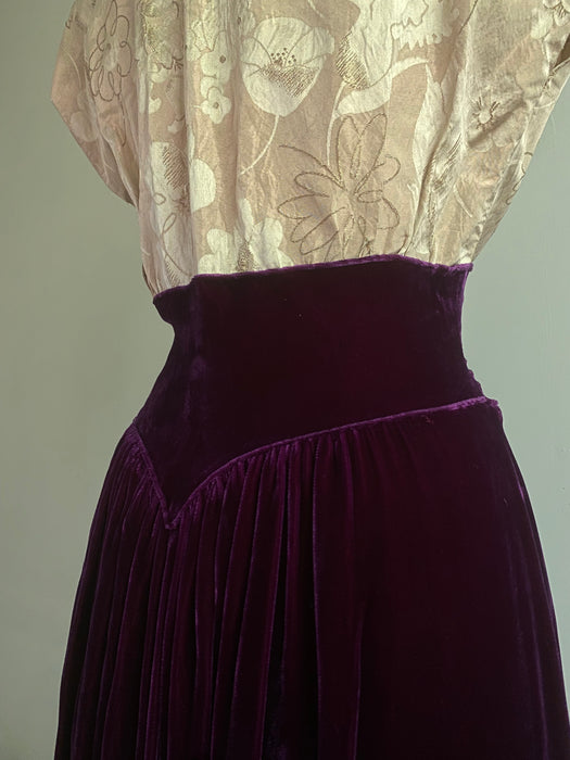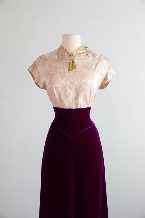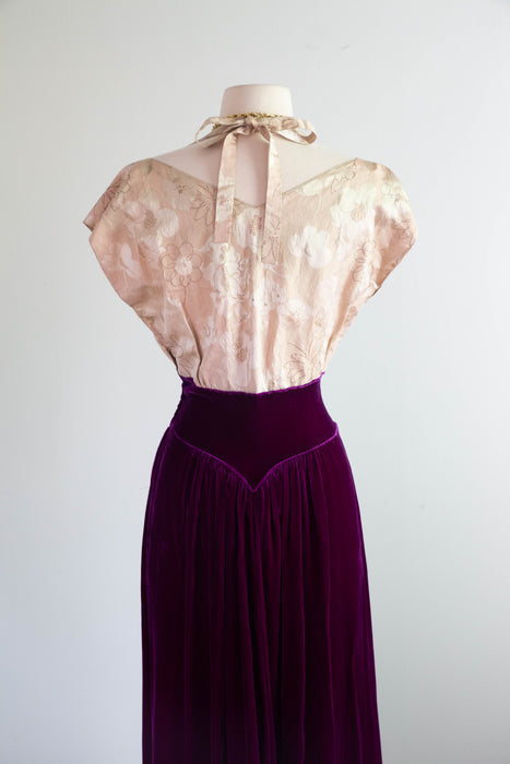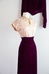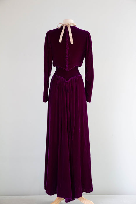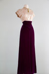 Absolutely stunning 1930's mulberry silk velvet evening dress with matching jacket. Featuring a dramatic silk brocade top with cut out shoulders and ties that tie into a bow in the back. The jacket has bust darts and buttons down the back. The high basque waist flatters and accentuates the waist. The skirt is gathered in the back and is quite full. Snaps up the side. In overall excellent condition, freshly dry cleaned and ready to wear.