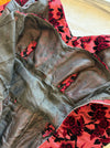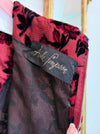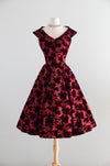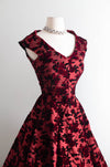 This exquisite 1950s cocktail dress by Adele Simpson embodies the designer’s reputation for elegance and sophistication. Crafted in a sumptuous silk with a richly textured flocked velvet floral motif, the dress showcases a striking interplay of deep crimson and black against a luminous rose-red ground. The fabric is both dramatic and tactile, lending the piece a couture-like quality.
