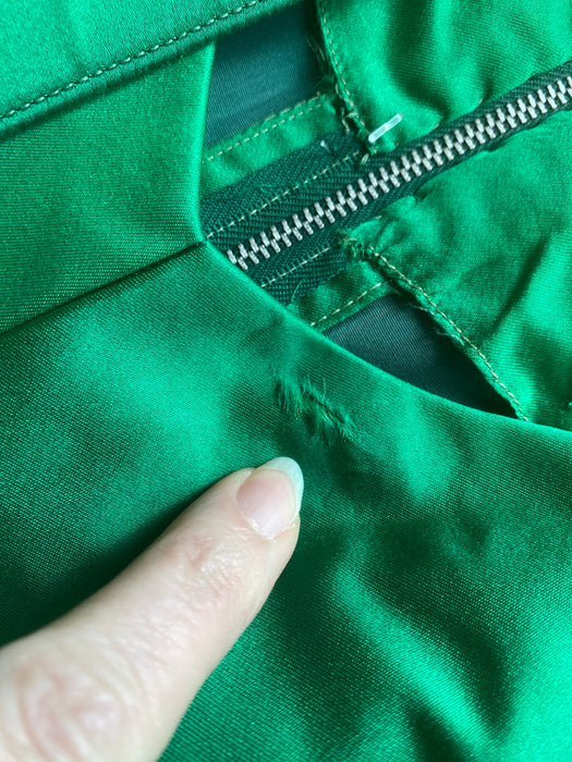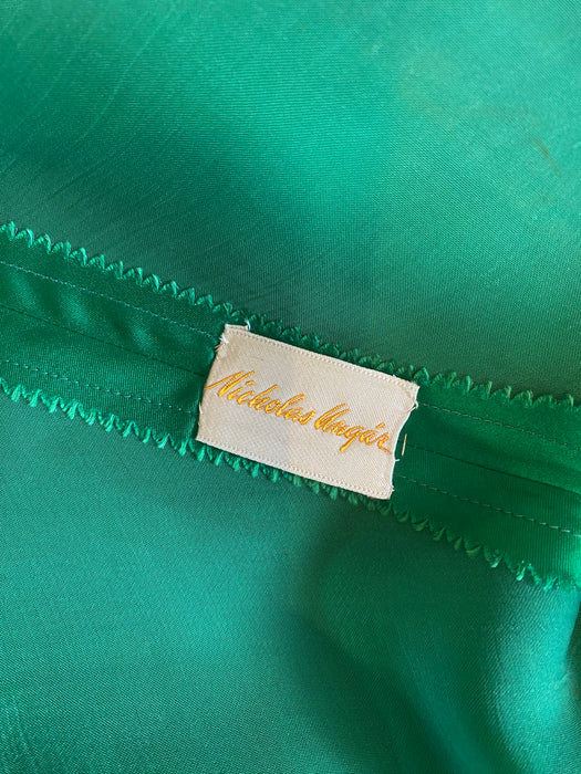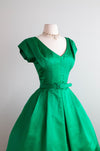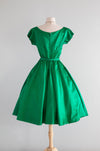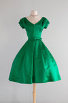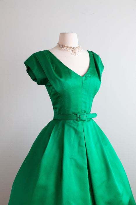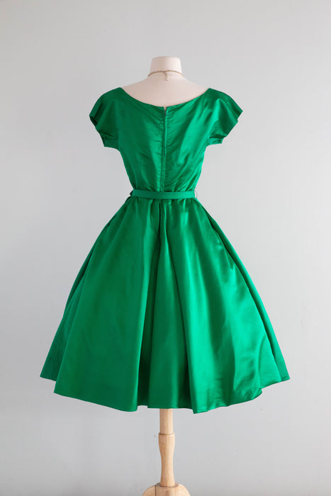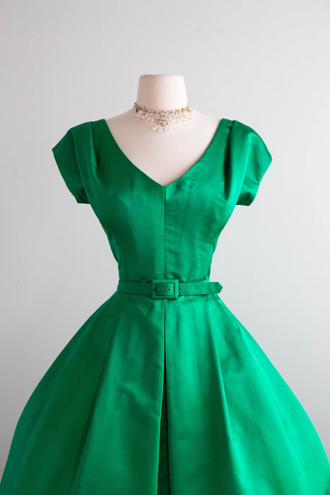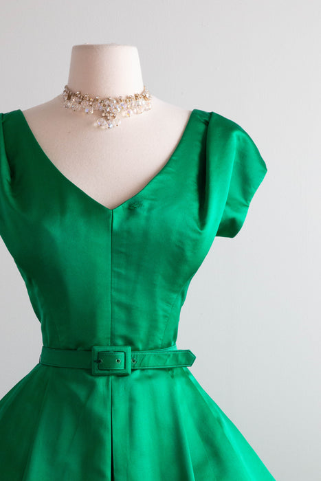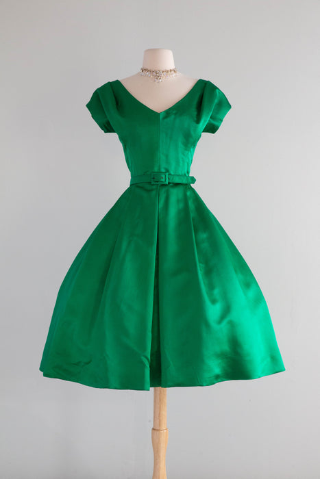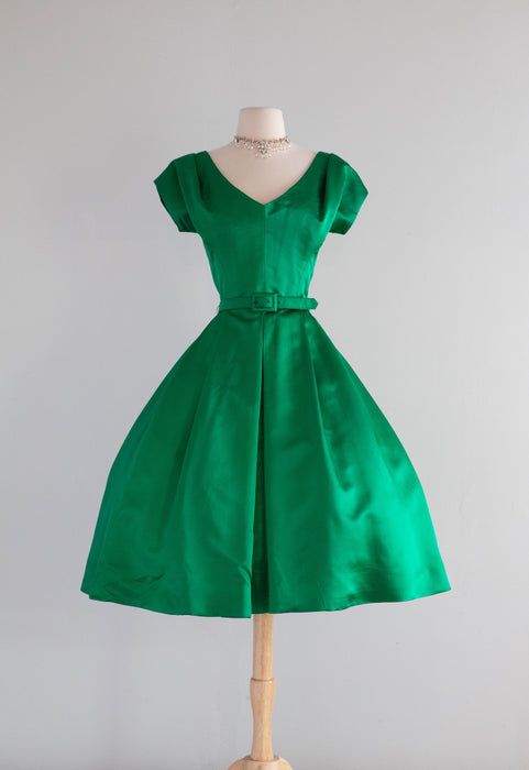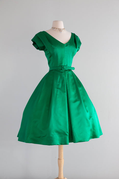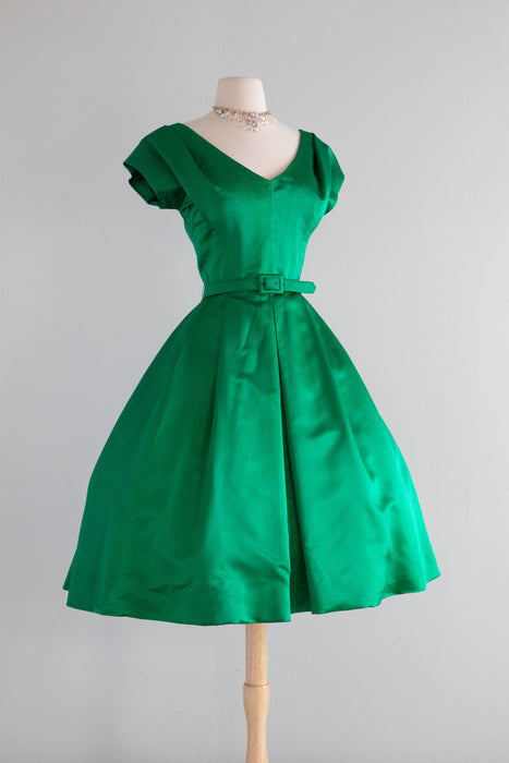1950's Demi Couture Emerald Green Silk Satin Cocktail Dress By Mollie Parnis / M