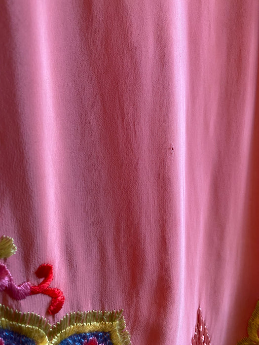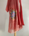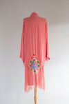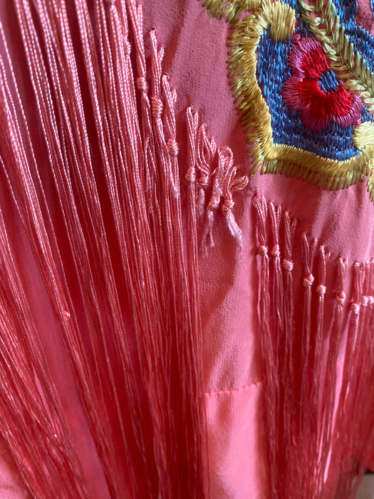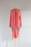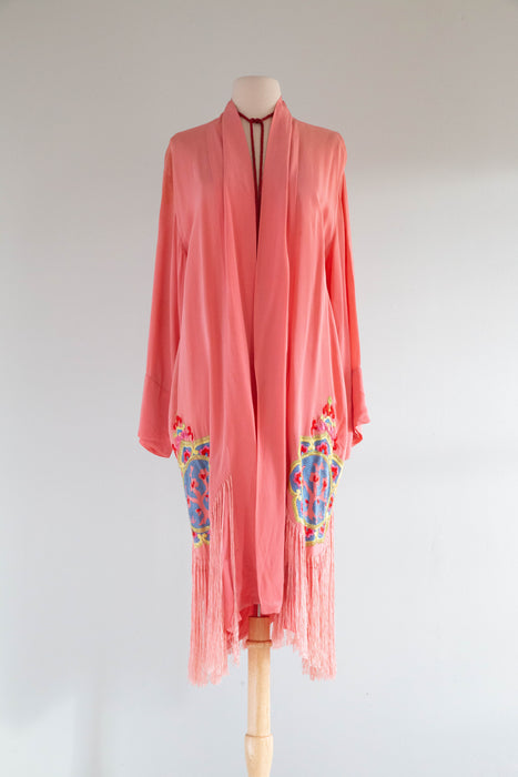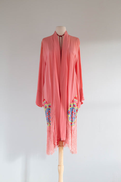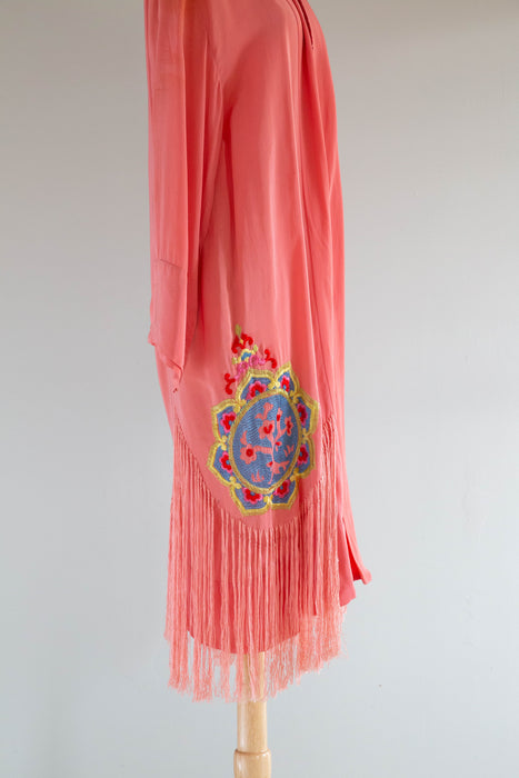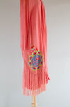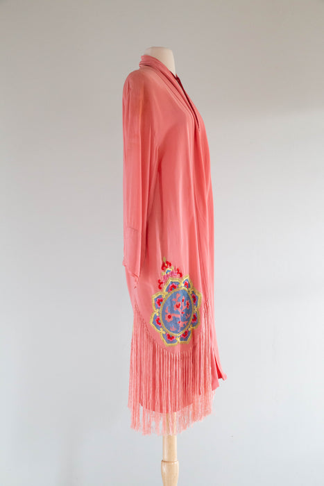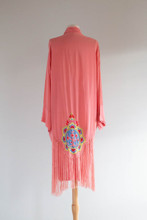 Decadent 1920's Coral Pink Viscose Robe With Embroidered Mandalas & Fringe / M
