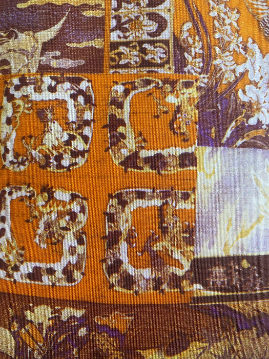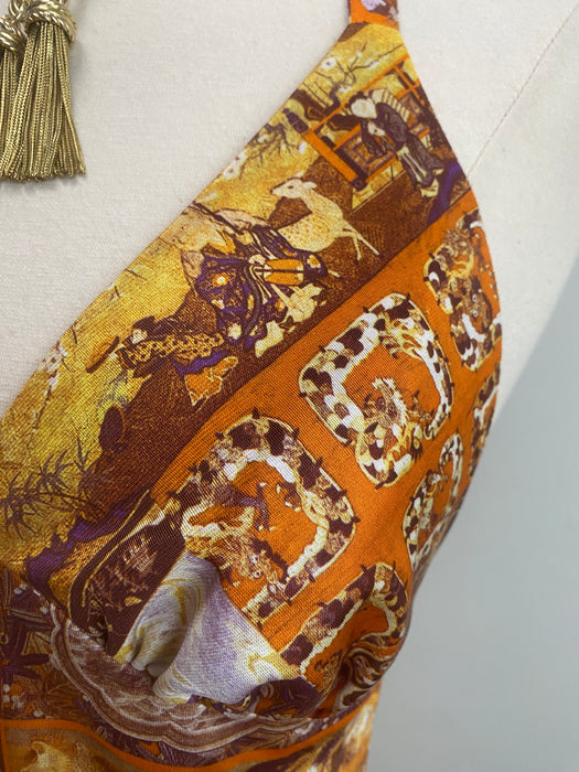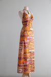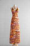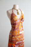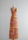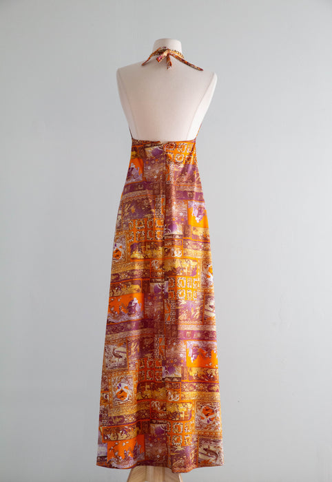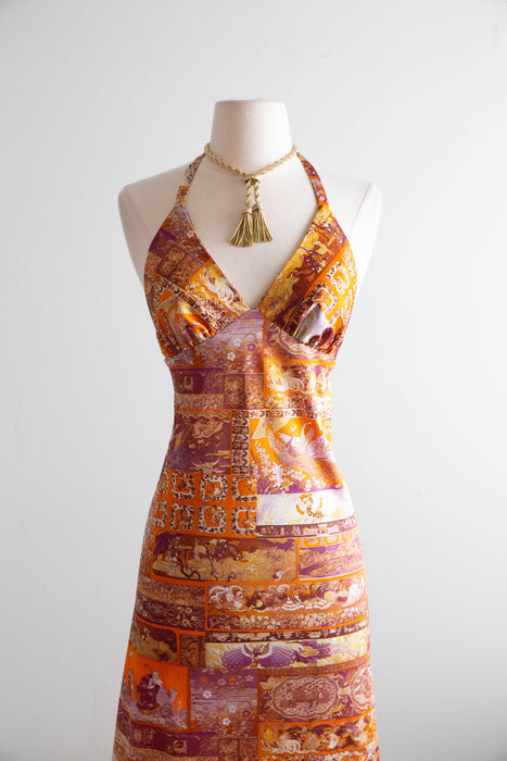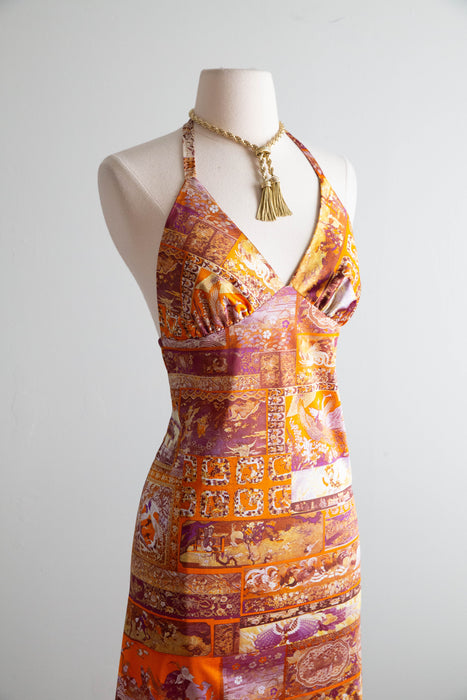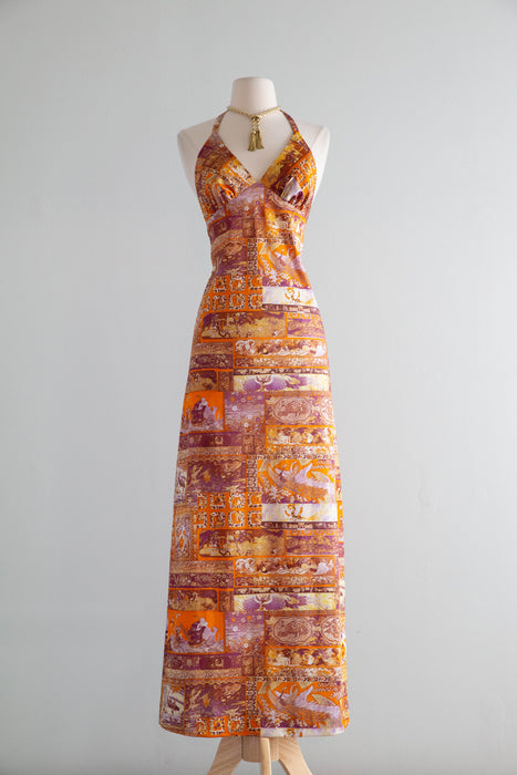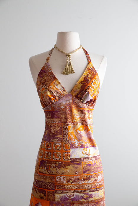 Incredible 1970's silky nylon jersey photo print maxi dress with an intricate Japanese motif. Dragons, cocks, butterflies, tigers, people make up this truly intoxicating print. Super sexy and figure flattering style with halter neckline and low back. Made by Anything Goes. Zips up the back. In excellent condition, freshly cleaned and ready to wear.