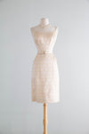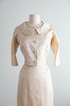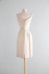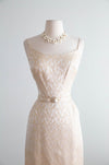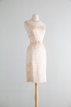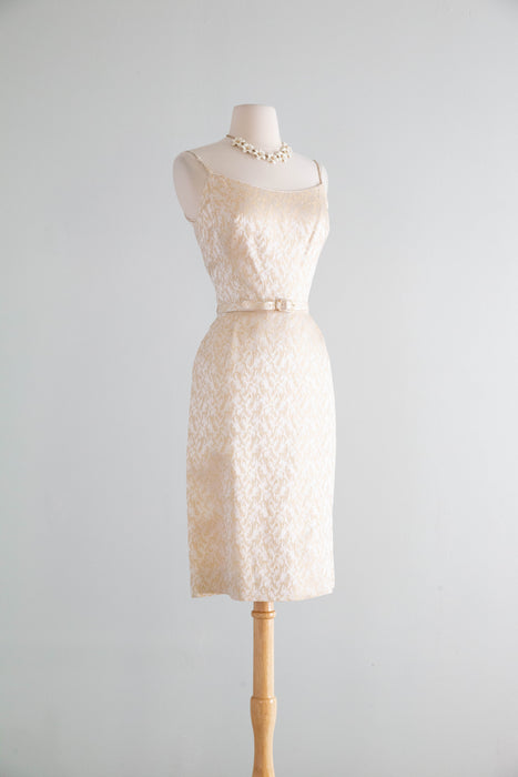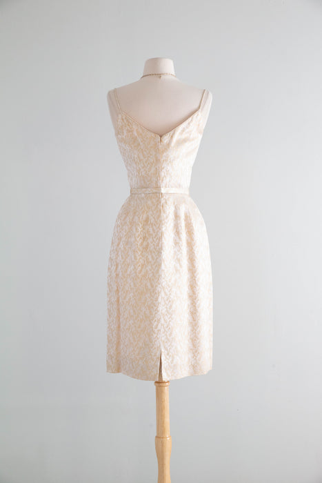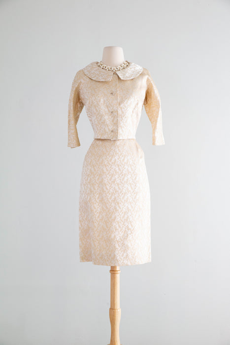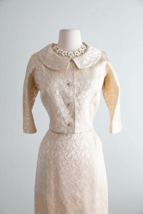 The epitome of mid-century glamour and sophistication! Fabulous early 1960's metallic gold brocade cocktail dress and matching jacket. Featuring a classic fitted silhouette with belted waist and spaghetti straps along with darling jacket with peter pan collar. Both pieces are lined and in excellent condition, freshly dry cleaned and ready to wear.