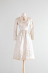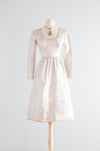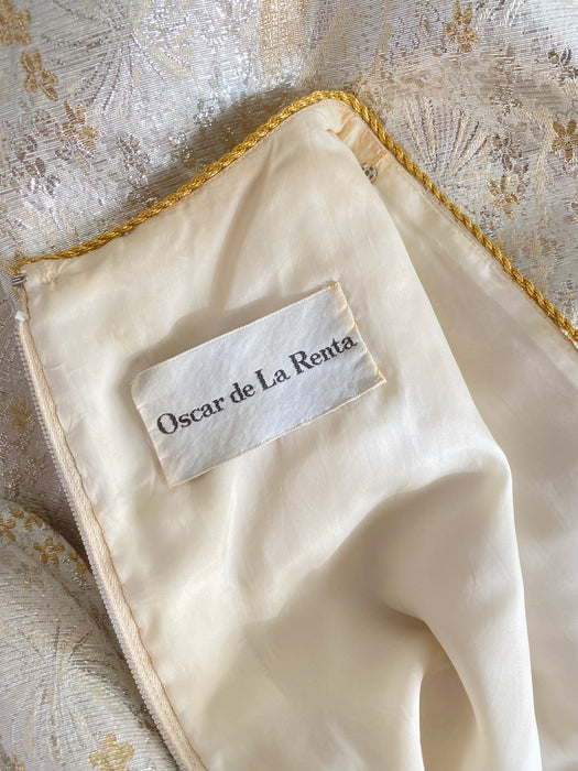 Stunning and elegant 1960's metallic silver & gold brocade cocktail dress by Oscar de la Renta. Featuring a flattering fitted waist, a semi full skirt, long zip down sleeves, a scoop neckline and optional wide sash. Perfect for an engagement or bridal event. Fully lined interior. One sassy side pocket. Fully lined interior, in overall excellent condition, freshly dry cleaned and ready to wear.