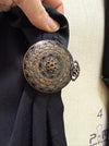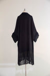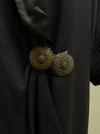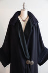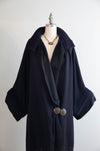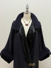 A magnificent example of late 1920s evening elegance, this navy blue wool gabardine coat captures the era’s fascination with draped silhouettes and luxurious textural contrast. The coat’s design is both sculptural and fluid—featuring a wide, cartridge pleated shawl collar and deep cuffs painstakingly pleated into ribbed channels of wool, creating dramatic structure around the neckline and sleeves. The body of the coat falls in sweeping, kimono-like folds, tapering gently at the waist with two large, repoussé metal buttons that secure the front in a graceful wrap closure. A lustrous black silk lining adds a note of sophistication and ease against the skin, while a long fringe hem imbues the piece with a sense of movement reminiscent of the Jazz Age’s exuberant spirit.
