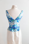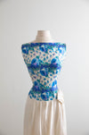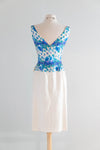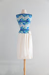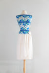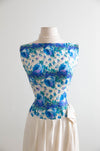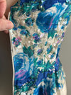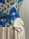 The bodice, crafted in a luminous floral silk satin, is hand-embroidered with iridescent sequins that shimmer over painterly blue, violet, and green roses against an ivory ground. The sculpted silhouette features a high bateau neckline that dips into a deeply cut V-back—both demure and alluring—emphasizing the nipped waist and hourglass line so emblematic of the decade. The ivory silk skirt drapes gracefully from the fitted waist into soft pleats and a faux wrap effect, accented by a sculptural side bow that adds just the right touch of drama. Fully lined and finished with a back metal zipper, this piece reflects Pat Sandler’s reputation for glamorous, high-quality ready-to-wear that bridged the gap between New York sophistication and Hollywood allure. In excellent condition, freshly dry cleaned and ready to wear.