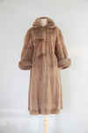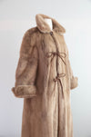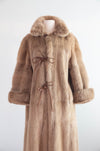 ~Plush mink side: Features supple panels of natural mink in a soft golden-beige hue, with rich sheen and elegant fluidity. The coat is finished with a rounded mink collar, cuffed sleeves, and suede tie closures at the waist for understated sophistication.